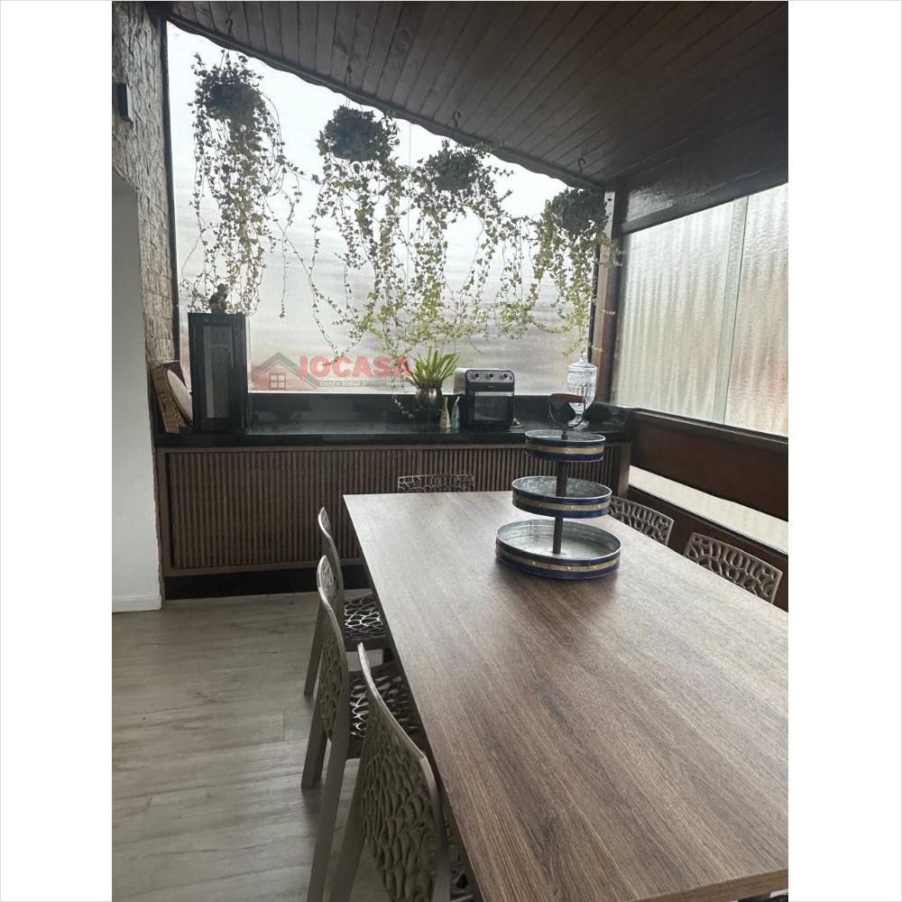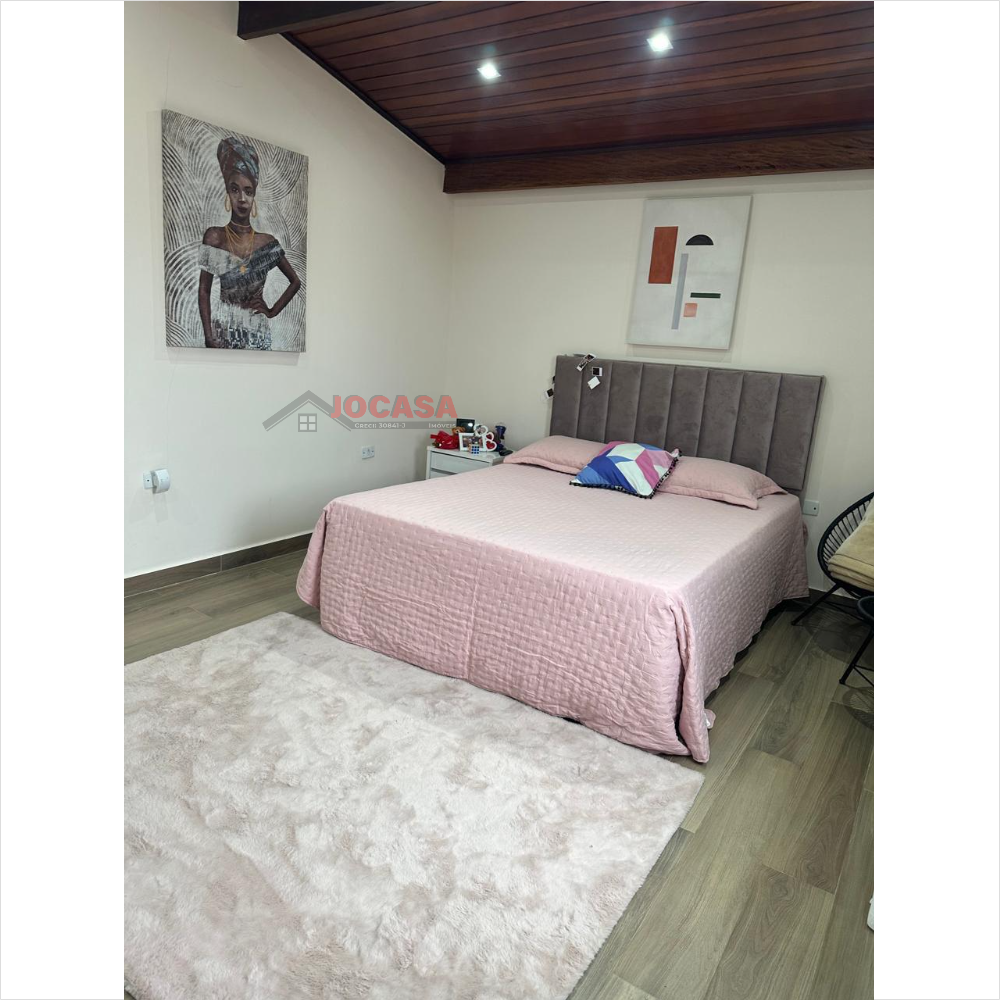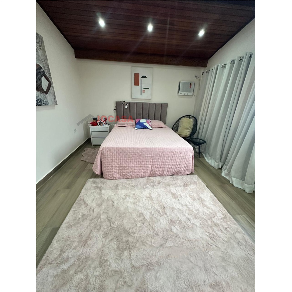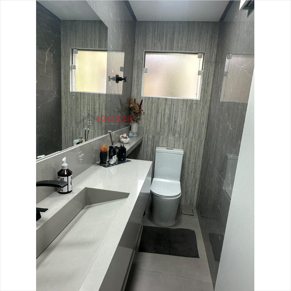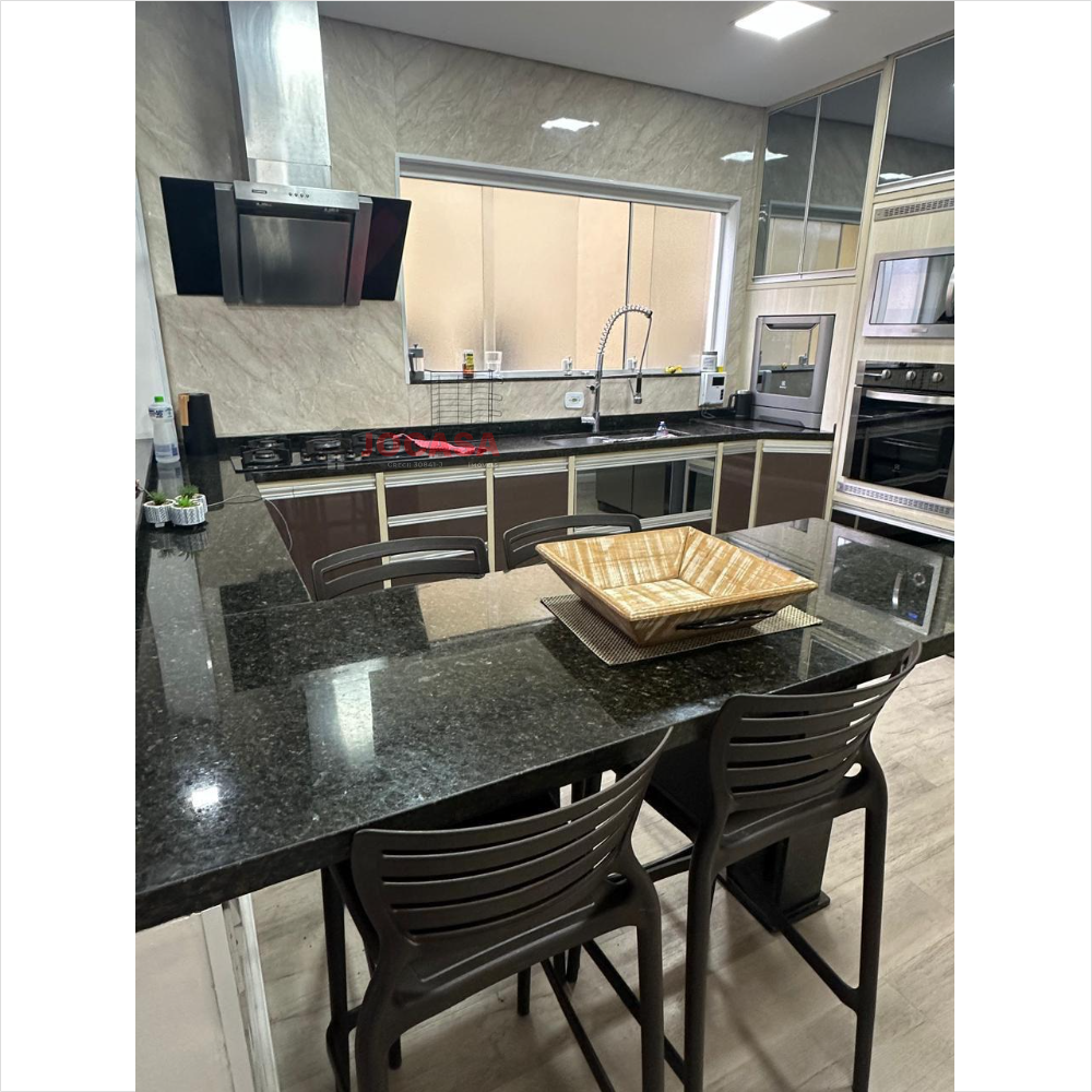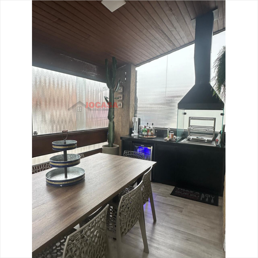 No andar superior, há duas suítes amplas, ambas com closet, sendo que a suíte principal inclui uma charmosa varanda. Este andar conta com armários embutidos, lavanderia coberta com fechamento em vidro, piso de carpete de madeira, uma espaçosa sala de estar e jantar com acabamento em gesso, sancas e iluminação LED embutida, além de ar-condicionado. A varanda gourmet é totalmente envidraçada e equipada com churrasqueira e pia. A cozinha planejada, isolada até o teto, complementa esse andar. Além disso, o imóvel dispõe de cinco vagas de garagem com banheiro, que podem ser transformadas em um elegante salão de festas, com portão automatizado.