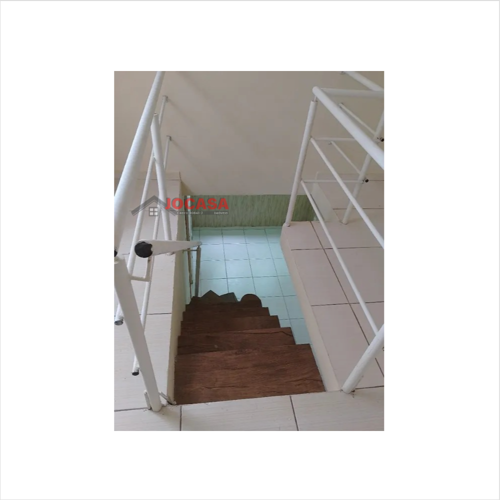 Andar debaixo: 3 quartos, sala, cozinha com armários embutidos, escada com corrimão e guarda-corpo
